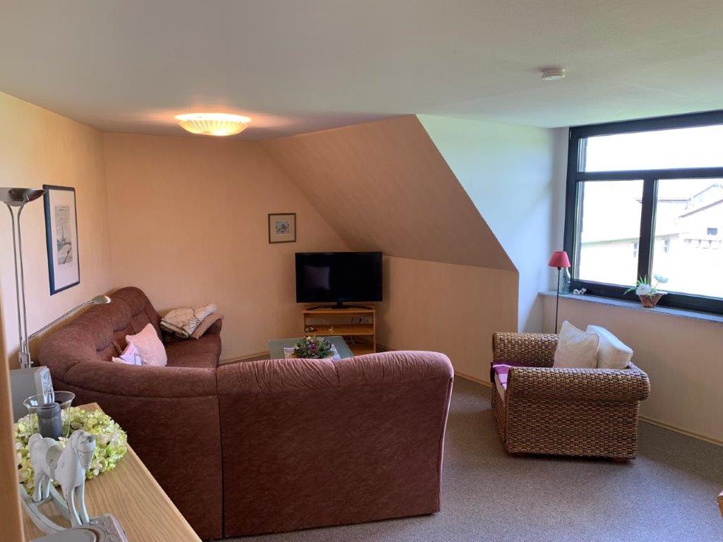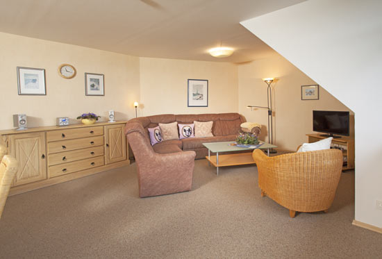 - Im Wohnzimmer gibt es Sat-TV und Internetzugang.